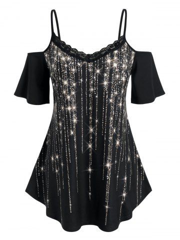 m*****s5Plus Size Cold Shoulder Glitter Print T-shirtColor: BLACK Size: 3X | US 22-24Love this top. It's so perfect for going out on the town. or going out for date night. It's so soft and the material is super flowy. perfect top for the summer. ordered 3XL but could of sized down. definitely recommend this shirt. absolutely gorgeous!