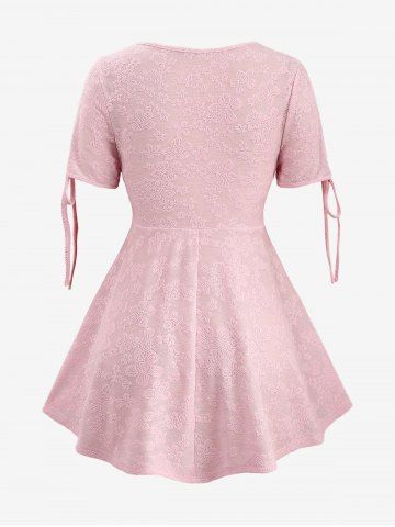 Plus Size T-shirts > Plus Size Twist Bowknot Textured Jacquard Floral Tied Sleeves Solid Top