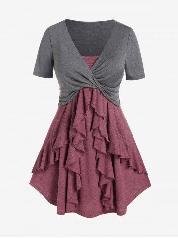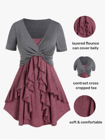 a*****h4Plus Size Flounce Lace Trim Colorblock Twofer TeeColor: DARK GRAY Size: 1X | US 14-16very flattering, comfortable, lightweight but warm, great for fall, loving the color