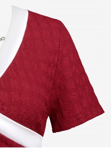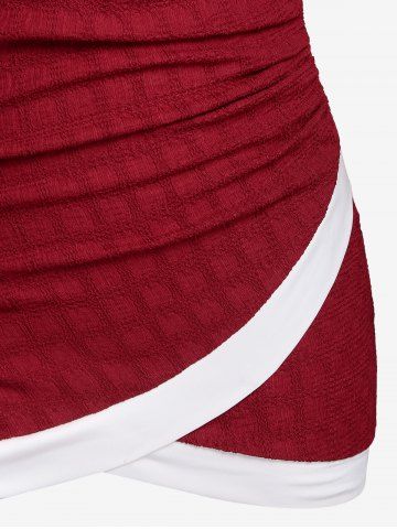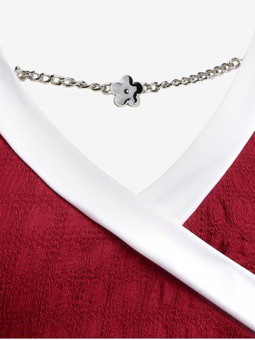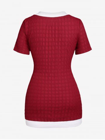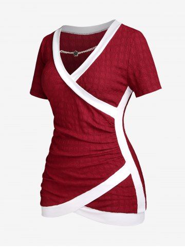 w*****a5Plus Size Two Tone Chain Surplice Textured TeeColor: DEEP RED Size: M | US 10This shirt is super cute and kind of stretchy. Lots of compliments on this shirt I was even told I look like a wrapped up present.