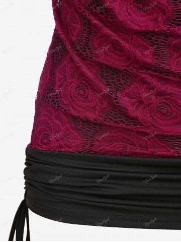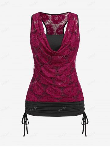 Plus Size Cowl Neck Cinched Rose Lace Tank Top - Deep Red - L | Us 12