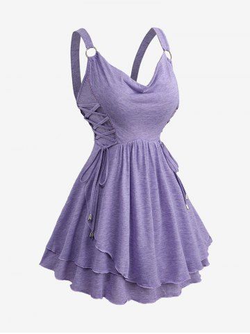 Plus Size Cowl Neck O-Ring Lace Up Ruffles Marled Heathered Tank Top - Purple - L | Us 12