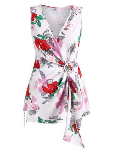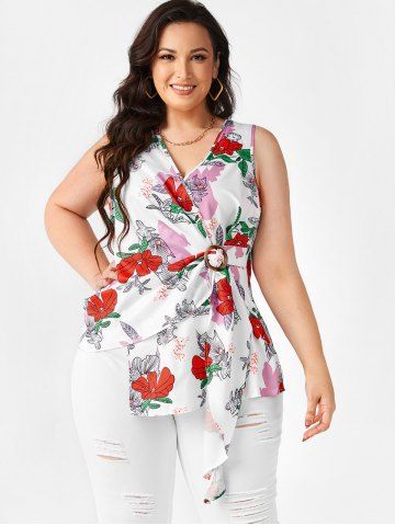S*****e5Plus Size Floral Wrap Tank TopColor: RED Size: 5XKind of complicated to put on, but it is really spectacular looking! This is a true wrap shirt. You have to tie the first side using the strings inside the shirt and the second side threads through the buckle and tightens, so it's completely adjustable to allow you to show as much or as little cleavage as you like. The judicious placement of a few safety pins will hold the shirt in place better than the buckle will, the fabric is slippery silky polyester, so it's shimmery and looks very posh, but doesn't hold in place. This is a fantastic date-night shirt to wear with a little skirt!