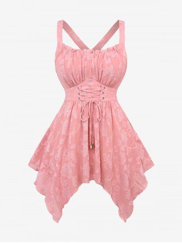 Plus Size Lace Up Grommets Ruffles Ruched Flowers Jacquard Crisscross Asymmetrical Tank Top - Light Pink - 5x | Us 30-32