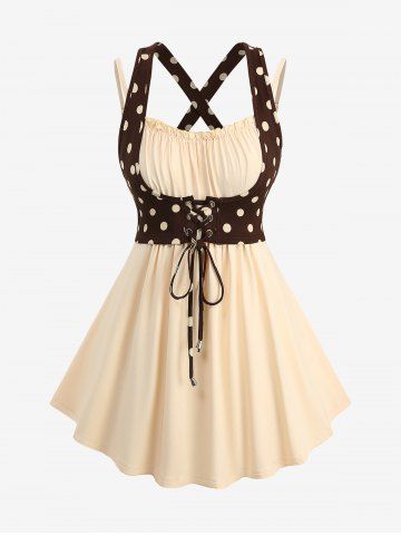 s*****45Plus Size Polka Dot Print Crisscross Lace Up Ruched Ruffles 2 In 1 Tank TopColor: LIGHT COFFEE Size: 2X | US 18-20Love the color combo, will be wearing this to ren faire