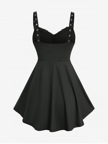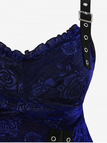 Plus Size Rose Flower Printed Crossover Bust Buckle Grommet Split Ribbed Layered Tank Top