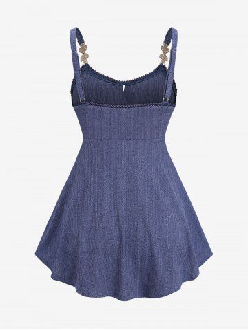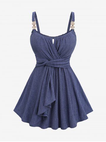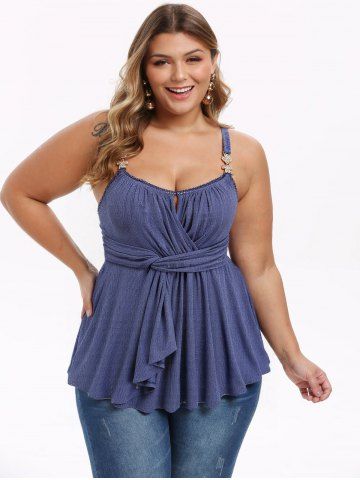 Plus Size Surplice Ruched Leaf Buckle Lace Trim Lettuce Hem Ribbed Textured Tank Top - Blue - M | Us 10
