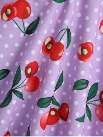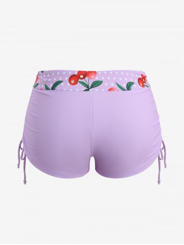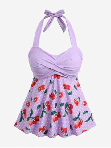 1950s Retro Cherry Dots Print Halter Ruched Cinched Boyleg Tankini Swimsuit - Light Purple - 2x