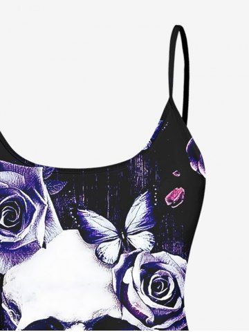 Distressed Rose Flower Butterfly Skull Printed Padded Boyleg Tankini Swimsuit (Adjustable Shoulder Strap) - Concord - 2x