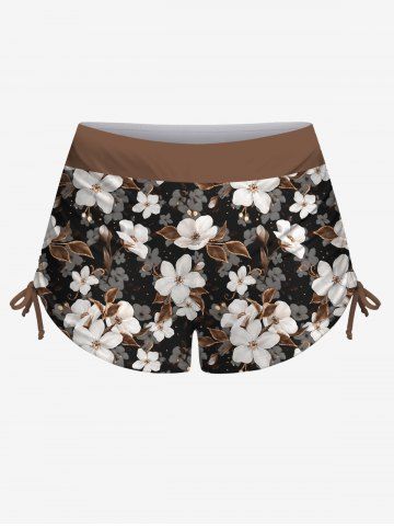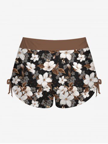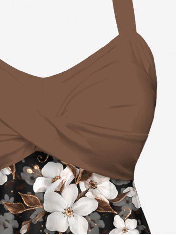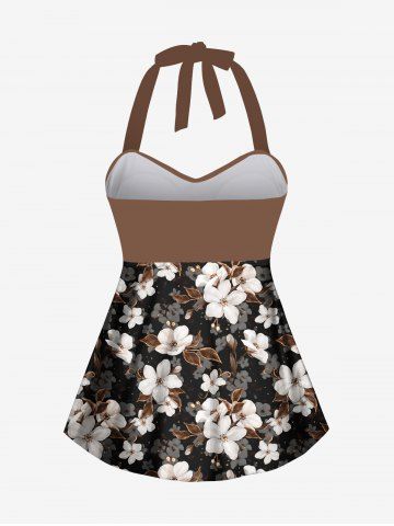 Fashion Floral Print Twist Backless Halter Cinched Boyleg Tankini Swimsuit (Adjustable Shoulder Strap) - Coffee - S