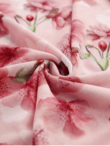 Fashion Ombre Peach Blossom Print Plunging Bowknot Tied Beach Cover Up Solid Boyleg 3 Pieces Tankini Swimsuit - Deep Red - M | Us 10