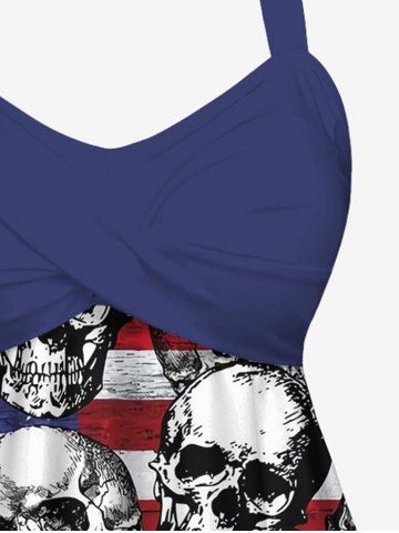 Fashion Skull Patriotic American Flag Twist Halter Backless Boyleg Cinched Tankini Swimsuit - Blue - 1x