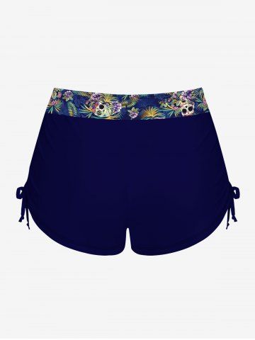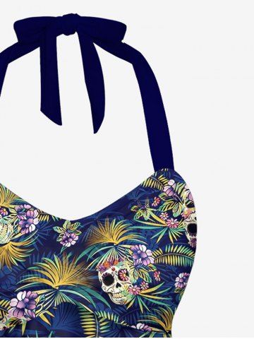 Fashion Skulls Floral Coconut Leaves Print Halter Twist Backless Cinched Hawaii Tankini Swimsuit - Deep Blue - L