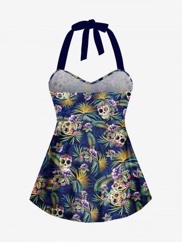 Plus Size Tankinis > Fashion Skulls Floral Coconut Leaves Print Halter Twist Backless Cinched Hawaii Tankini Swimsuit