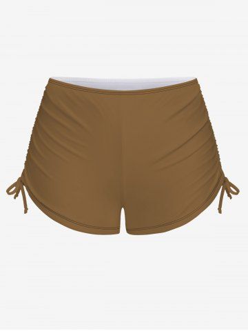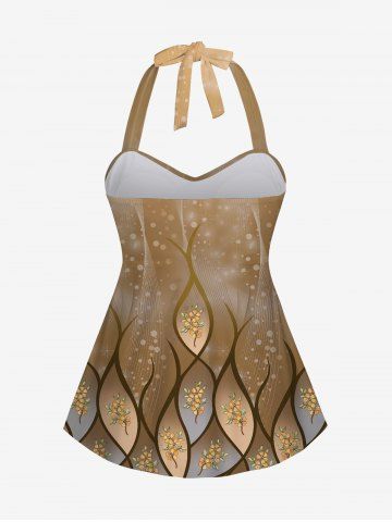 Flower Print Halter Twist Cinched Boyshort Tankini Set - Coffee - L