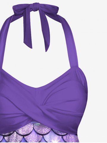 Glitter Ombre Mermaid Scale Print Hawaii Twist Halter Backless Boyleg Tankini Swimsuit - Light Purple - 2x