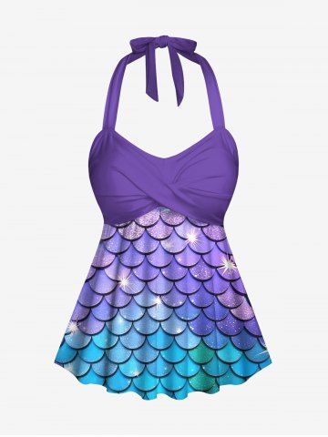 Plus Size Tankinis > Glitter Ombre Mermaid Scale Print Hawaii Twist Halter Backless Boyleg Tankini Swimsuit