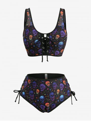 Gothic Plus Size Colorful Skull Stars Print Lace Up Tankini Swimsuit - Black - M | Us 10