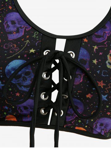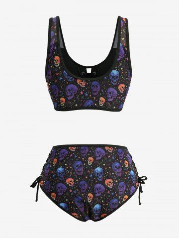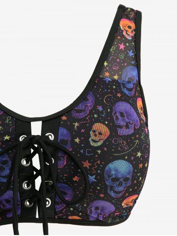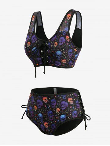 Gothic Plus Size Colorful Skull Stars Print Lace Up Tankini Swimsuit - Black - L | Us 12