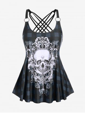 Gothic Skull Plaid Padded Boyleg Strappy Modest Tankini Swimsuit - Dark Gray - 3x | Us 22-24