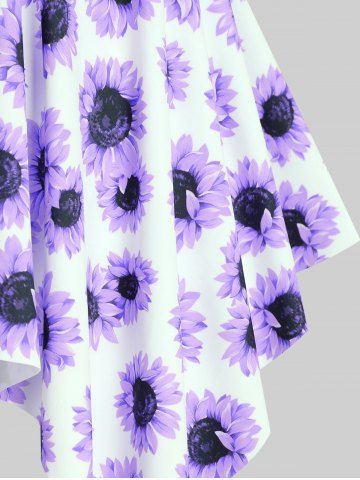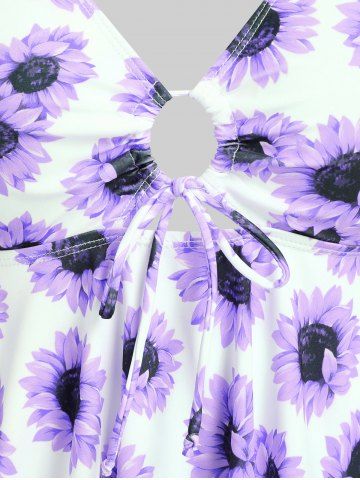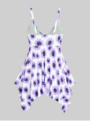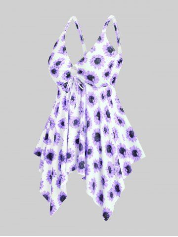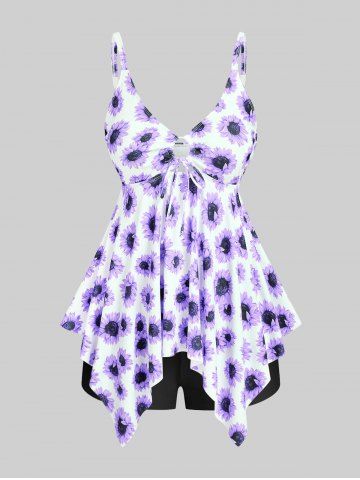 Handkerchief Sunflower Print Cinched Plus Size & Curve Modest Tankini Swimsuit - Purple - L