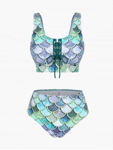 Mermaid Print Lace Up Three Piece Tankini Swimsuit