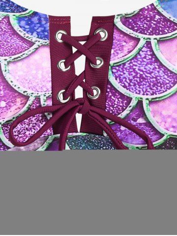 Mermaid Print Lace Up Three Piece Tankini Swimsuit - Deep Red - 2x | Us 18-20