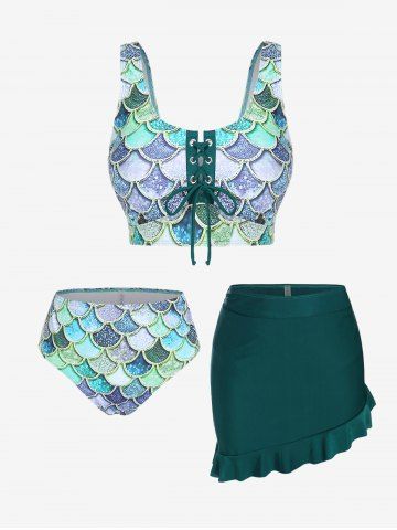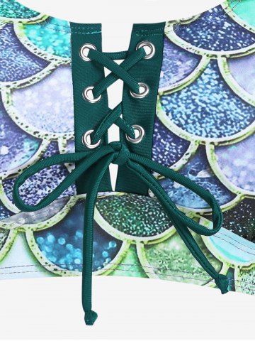 Mermaid Print Lace Up Three Piece Tankini Swimsuit - Deep Green - M | Us 10