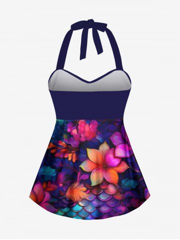 Plus Size Tankinis > Ombre Mermaid Scale Flower Print Hawaii Twist Halter Backless Boyleg Tankini Swimsuit
