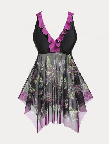 Plus Size Tankinis > Paisley Print Mesh Panel Plus Size & Curve Handkerchief Tankini Swimsuit