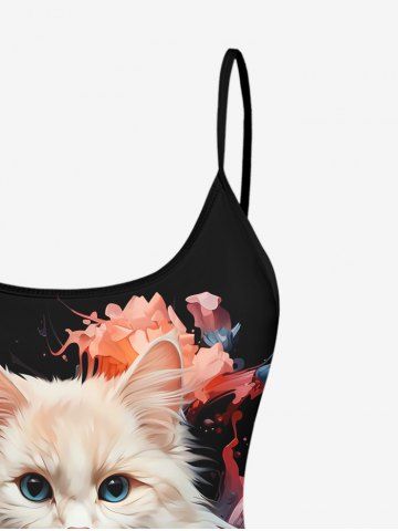Plus Size Cat Flowers Print Boyshorts Tankini Set - Black - S