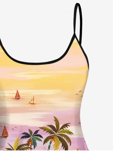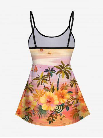 Hawaii Plus Size Coconut Tree Flower Sea Sailboat Print Boyleg Tankini Swimsuit (Adjustable Shoulder Strap) - Light Orange - L
