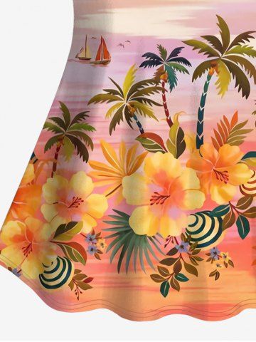 Plus Size Tankinis > Hawaii Plus Size Coconut Tree Flower Sea Sailboat Print Boyleg Tankini Swimsuit (Adjustable Shoulder Strap)