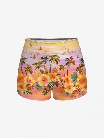 Plus Size Tankinis > Hawaii Plus Size Coconut Tree Flower Sea Sailboat Print Boyleg Tankini Swimsuit (Adjustable Shoulder Strap)