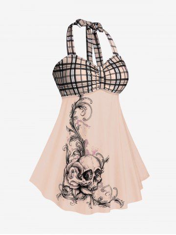 Plus Size Tankinis > Plus Size & Curve Halter Plaid Skull Print Backless Gothic Modest Tankini Swimsuit