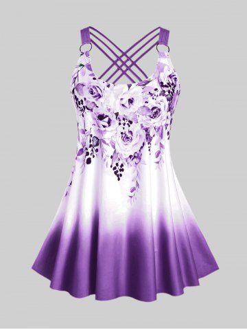 Plus Size Tankinis > Plus Size & Curve Ombre Color Floral Print Crisscross Modest Tankini Swimsuit