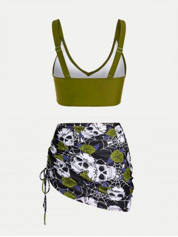 Plus Size & Curve Skull Rose Print Crossover Three Piece Bikini Swimsuit - Green - 4x