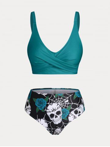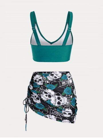 Plus Size & Curve Skull Rose Print Crossover Three Piece Bikini Swimsuit - Deep Green - L