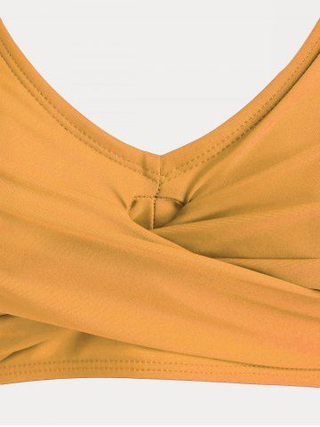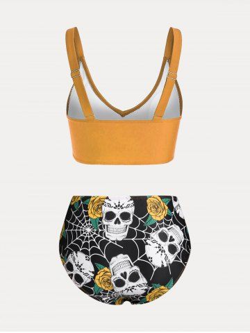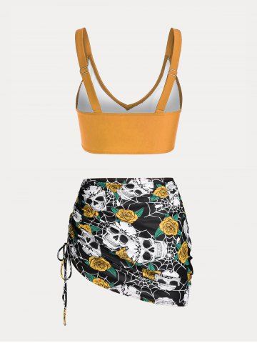 Plus Size & Curve Skull Rose Print Crossover Three Piece Bikini Swimsuit - Yellow - 3x