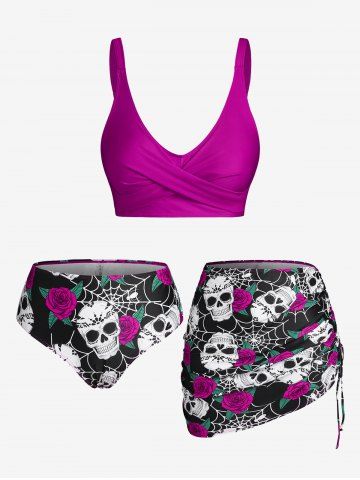 Plus Size Tankinis > Plus Size & Curve Skull Rose Print Crossover Three Piece Bikini Swimsuit