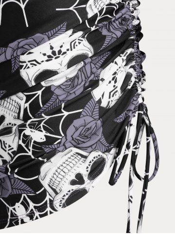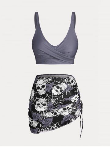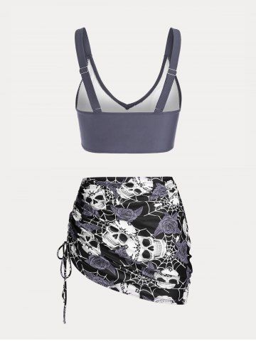 Plus Size & Curve Skull Rose Print Crossover Three Piece Bikini Swimsuit - Gray - L