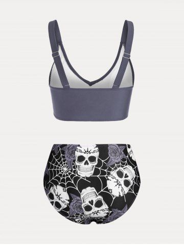 Plus Size & Curve Skull Rose Print Crossover Three Piece Bikini Swimsuit - Gray - 5x