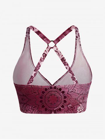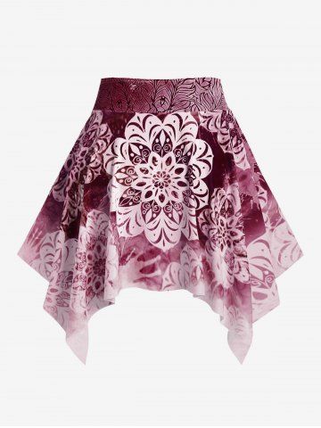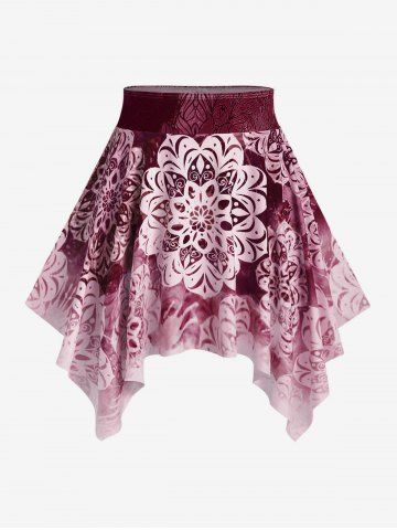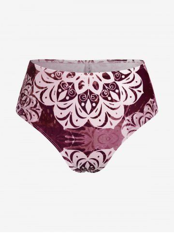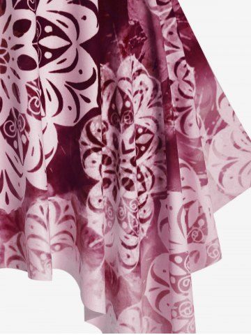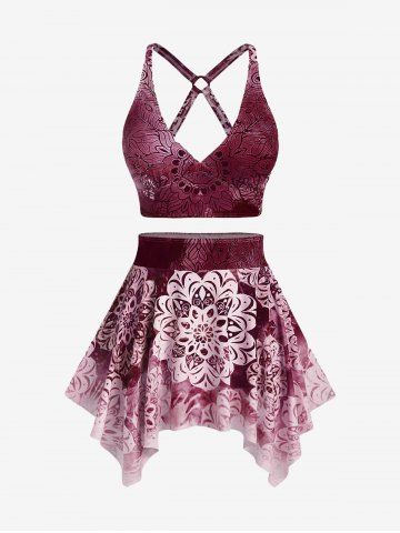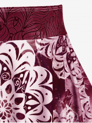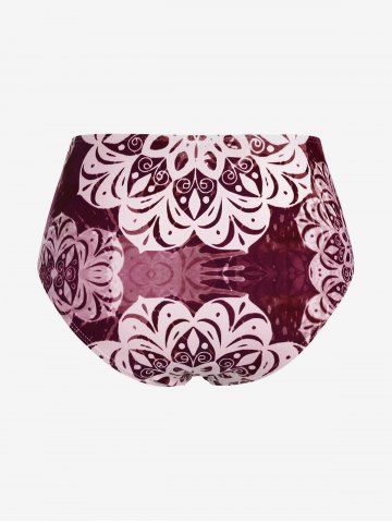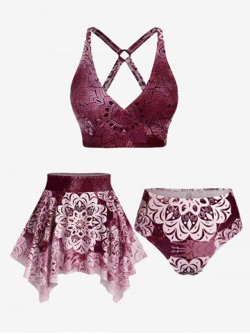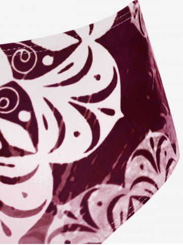 Plus Size Ethnic Printed Ombre O-ring Padded Three Piece Skirt Tankini Swimsuit - Red Wine - L | Us 12