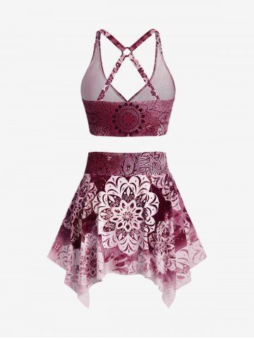 Plus Size Ethnic Printed Ombre O-ring Padded Three Piece Skirt Tankini Swimsuit - Red Wine - 1x | Us 14-16