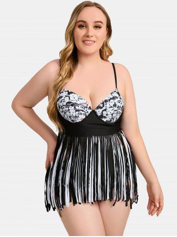 Plus Size Faces Print Tassel Tankini Swimsuit - Black - 3x | Us 22-24