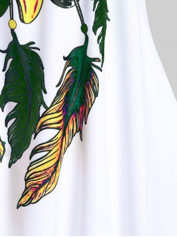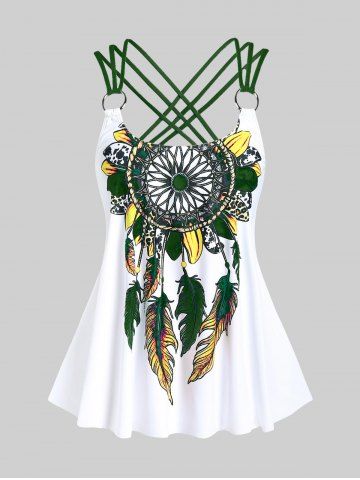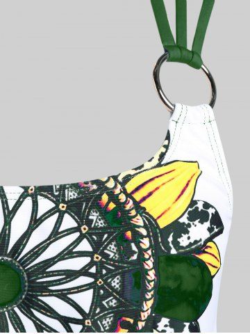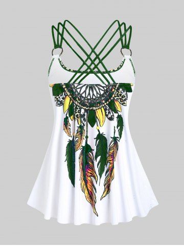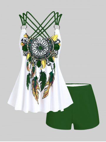 Plus Size Feather Print Crisscross Strappy Back Rings Boyshorts Tankini Swimsuit - Plant Green - 3x | Us 22-24
