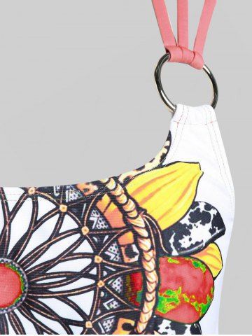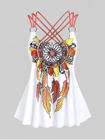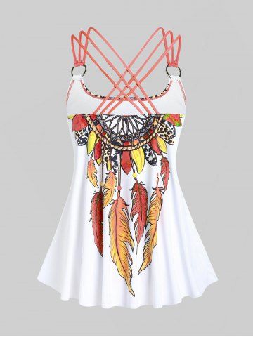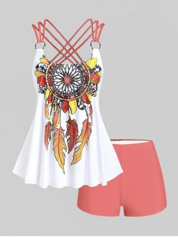 Plus Size Tankinis > Plus Size Feather Print Crisscross Strappy Back Rings Boyshorts Tankini Swimsuit