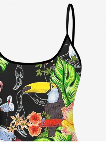 Plus Size Flamingo Tropical Flower Leaf Print Boyleg Hawaii Tankini Swimsuit - Black - S