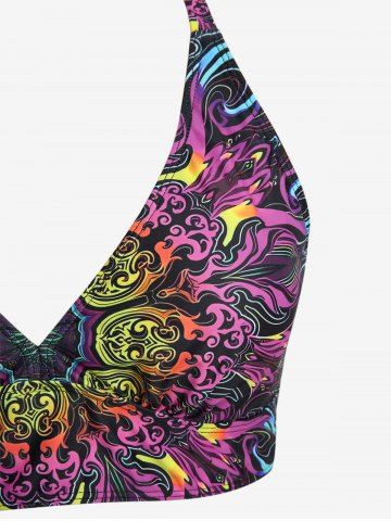 Plus Size Tankinis > Plus Size Floral Retro Pattern Print Crisscross Strapy Ruched Skirted Tankini Swimsuit