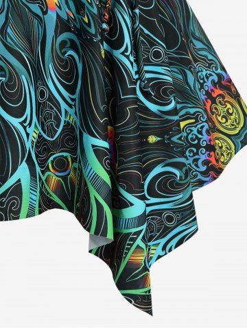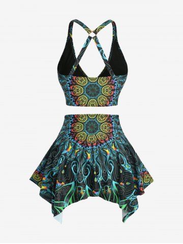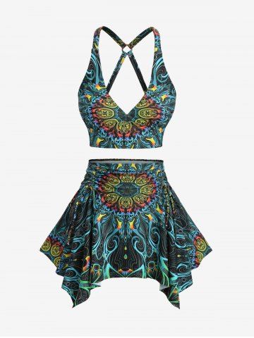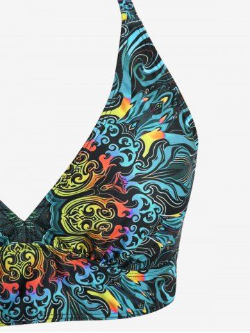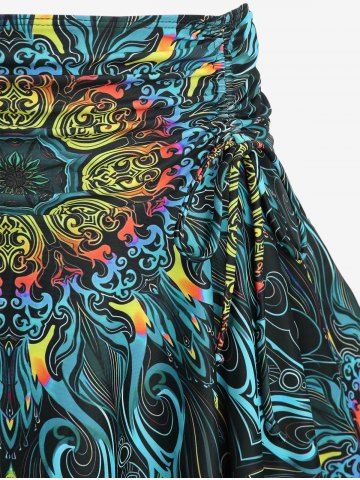 Plus Size Tankinis > Plus Size Floral Retro Pattern Print Crisscross Strapy Ruched Skirted Tankini Swimsuit